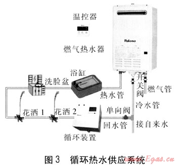 第二種方案:熱水器依然安裝于戶外陽(yáng)臺(tái),另為熱水器添置一套循環(huán)裝置(含小型水泵、水溫設(shè)定及感應(yīng)裝置、顯示屏等),組成一個(gè)家用中央循環(huán)熱水供應(yīng)系統(tǒng)(見圖3)。用戶在每次使用熱水之前,只要先開啟室內(nèi)任意一個(gè)熱水出水口的水龍頭,流水約1~2s再關(guān)閉,這樣就給了循環(huán)水泵一個(gè)啟動(dòng)運(yùn)行的信號(hào),循環(huán)水泵開始自動(dòng)循環(huán)。熱水器的水流感應(yīng)器感應(yīng)到水流就會(huì)啟動(dòng)燃燒。當(dāng)循環(huán)水泵機(jī)盒感應(yīng)器感應(yīng)到循環(huán)管路中水溫上升到預(yù)先設(shè)定的溫度,如40℃時(shí),循環(huán)水泵就會(huì)自動(dòng)停止工作。然后,要使用熱水時(shí)一開水龍頭即時(shí)就有設(shè)定水溫的熱水出來了。相應(yīng)冷熱水循環(huán)管道需于樓宇建造期間預(yù)先暗埋敷設(shè),而熱水管最好能適當(dāng)絕熱。