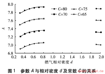 對(duì)于常用的城市燃?xì)鈿庠?,人工煤氣的相?duì)密度一般為0.3~0.55,天然氣的相對(duì)密度為0.5~0.8,液化石油氣的相對(duì)密度為1.9~2.0,與燃具幾何參數(shù)有關(guān)的常數(shù)C一般為65~80。當(dāng)燃?xì)庀鄬?duì)密度為[0.3,0.8]及[1.9,2.0],考慮常數(shù)C=65,70,75,80四種情況,繪制A與d的關(guān)系曲線,見(jiàn)圖1??梢钥闯?,在所考慮的范圍內(nèi),A并非為一定值,而是隨著相對(duì)密度的增大而有所變化。因此,利用式(1)和(3)來(lái)計(jì)算一次空氣系數(shù),必然會(huì)引起計(jì)算誤差。