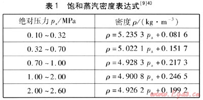 飽和蒸汽不同于理想氣體,不能通過氣體狀態(tài)方程來計(jì)算其密度;也不同于過熱蒸汽,不能用以溫度和壓力為自變量的近似公式來計(jì)算其密度;只能用以溫度或壓力為自變量的近似公式來計(jì)算其密度。以壓力為函數(shù)的飽和蒸汽密度表達(dá)式見表1,飽和蒸汽密度表達(dá)式在相應(yīng)的壓力范圍內(nèi)精度比較高。