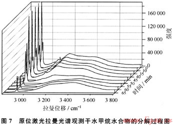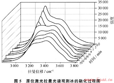 圖5是原位激光拉曼光譜測(cè)定冰融化過程的譜圖,從該譜圖中可以看到,隨著系統(tǒng)溫度的不斷升高,冰的四面體結(jié)構(gòu)逐漸瓦解,氫鍵數(shù)目逐漸減少,峰包的高波數(shù)側(cè)不斷上揚(yáng),而低波數(shù)端不斷消亡,從該譜圖上看冰的融化過程幾乎是水結(jié)冰的逆過程。