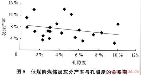 霍林河地區(qū)煤熱演化程度低,還沒有達(dá)到大量生烴階段,煤層氣組分以生物氣為主,含少量煤熱解氣(圖4)。從煤巖煤質(zhì)上看,霍林河地區(qū)煤層鏡質(zhì)組含量高,對(duì)煤層氣成藏有利。金振奎等通過沁水盆地分析了灰分產(chǎn)率對(duì)煤儲(chǔ)層性能的影響,認(rèn)為無機(jī)物一般充填于煤孔隙及裂隙[10],占據(jù)孔裂隙空間。并根據(jù)之間的關(guān)系統(tǒng)計(jì),得出灰分產(chǎn)率與孔隙度之間呈線性負(fù)相關(guān)。本次研究用低煤階樣品也得出同樣的關(guān)系(圖5):即灰分產(chǎn)率越高,孔隙度越低。低煤階煤層氣氣運(yùn)移通道主要以孔隙型為主。因此對(duì)于低煤階煤儲(chǔ)層,灰分含量對(duì)煤儲(chǔ)層滲透性有較大影響,灰分越大,煤儲(chǔ)層滲透性越差。
