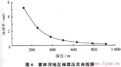 煤層氣勘探試驗(yàn)注入、壓降測(cè)試煤層埋深900m,煤層滲透率為0.91mD。對(duì)煤層進(jìn)行壓實(shí)曲線分析表明(圖6):煤層埋深100~500m,每增加100m,滲透率降低2.1mD;而在埋深500~900m,埋深每增加100m,滲透率降低0.1mD。說明埋藏早期以大孔隙壓實(shí)為主,后期以微孔隙壓實(shí)為主??傮w本區(qū)煤儲(chǔ)層物性好,滲透性較高,淺部煤層滲透率將更高。