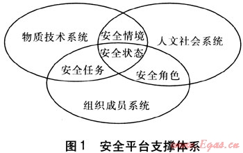 物質(zhì)技術(shù)系統(tǒng)、人文社會(huì)系統(tǒng)和組織成員系統(tǒng)3個(gè)集合的交叉構(gòu)成了3種聯(lián)系,形成安全情境、安全任務(wù)、安全角色和安全狀態(tài)4個(gè)交集。其中物質(zhì)技術(shù)系統(tǒng)與人文社會(huì)系統(tǒng)的交集構(gòu)成了管道燃?xì)馄髽I(yè)所處的軟環(huán)境和硬環(huán)境,稱為安全情境。人文社會(huì)系統(tǒng)與組織成員系統(tǒng)的交集決定了管道燃?xì)馄髽I(yè)中員工在安全生產(chǎn)中的身份,稱為安全角色。物質(zhì)技術(shù)系統(tǒng)與組織成員系統(tǒng)的交集劃定了組織成員在生產(chǎn)中所擔(dān)負(fù)的責(zé)任,稱為安傘任務(wù)。物質(zhì)技術(shù)系統(tǒng)、人文社會(huì)系統(tǒng)和組織成員系統(tǒng)三者的交集成為管道燃?xì)馄髽I(yè)的安全狀態(tài)。安全平臺(tái)支撐體系見(jiàn)圖1。