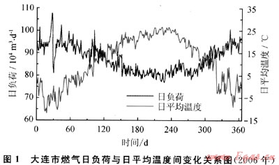 根據(jù)本文參考文獻(xiàn)[10]、[11]可知,在各類(lèi)氣象因素中,溫度是影響城市燃?xì)庳?fù)荷的核心因素。圖1為大連市2006年全年燃?xì)馊肇?fù)荷隨日平均溫度的變化情況,從中不難發(fā)現(xiàn)二者間存在緊密的反向變化關(guān)系。