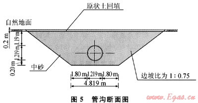 對于圖3中Ⅱ-Ⅱ斷面的管溝,管溝挖深為2.809m,溝底寬度為4.819m,邊坡比為1:0.75,如圖5所示。
