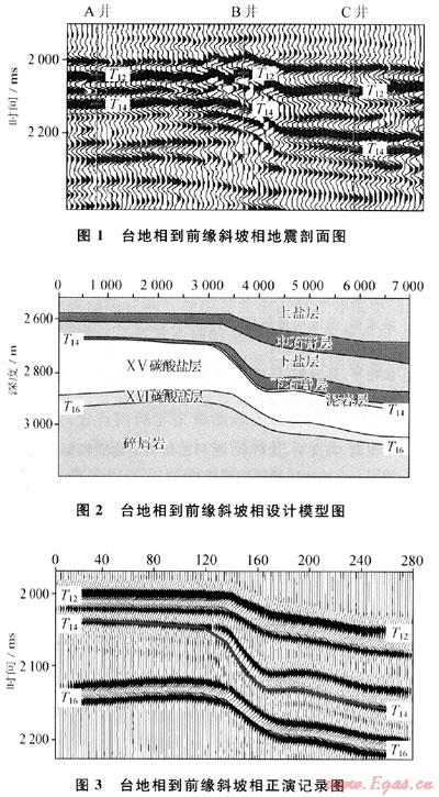 研究區(qū)3口測井資料對碳酸鹽巖頂界(T14)的標定結(jié)果見圖1。從圖中可見:臺地相和前緣斜坡相的碳酸鹽巖頂界并不在同一相位上。這對進一步的追蹤和解釋帶來了不確定性?;趨^(qū)域地質(zhì)和鉆測井資料分析,設計了沉積相變區(qū)地震地質(zhì)模型(圖2):臺地相ⅩⅥ碳酸鹽巖層厚度為50~70m,ⅩⅤ碳酸鹽巖層厚度為300~360m,下石膏層厚度為8~15m,下鹽層厚度為70~100m,中石膏層厚度為30~50m;前緣斜坡相ⅩⅥ碳酸鹽巖層厚度為40~60mm,ⅩⅤ碳酸鹽巖層厚度為80~180m,泥巖層厚度為4~38m,下石膏層厚度為20~80m,下鹽層厚度為40~200m,中石膏層厚度為100~140m;中下侏羅統(tǒng)速度為4100m/s,密度為2.40g/cm3;ⅩⅥ碳酸鹽巖層速度為5900m/s,密度為2.75g/cm3;ⅩⅤ碳酸鹽巖層速度為5600m/s,密度為2.65g/cm3;泥巖層速度為4200m/s,密度為2.45g/cm3;下石膏層和中石膏層的速度為6000m/s,密度為2.96g/cm3;下鹽層和上鹽層速度為4500m/s,密度為2.50g/cm3。取Ricker子波作為入射脈沖,依據(jù)實際地震資料選取的地震波主頻為30Hz。通過波動方程正演計算,得到的理論地震記錄見圖3。