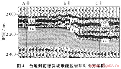 理論記錄與實際地震剖面的對比表明,從臺地相到前緣斜坡相,碳酸鹽頂界反射(T14)“竄相位”。這證明了井資料標定結(jié)果的準確性。圖中還可以看出,前緣斜坡相碳酸鹽巖反射振幅能量比臺地相的要弱一些,這與實際地震記錄的情況也是一致的。據(jù)此,落實了碳酸鹽巖頂界的解釋與對比方案(圖4)。