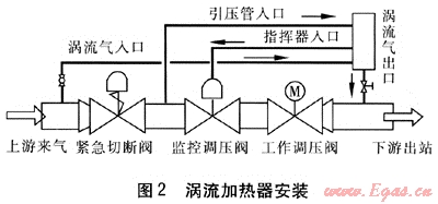 武漢西計量站來自西氣東輸淮武管道的天然氣壓力為5.0MPa,而下游供氣壓力約為1.4MPa。因此,在調(diào)壓分輸時,存在較大的節(jié)流。調(diào)壓橇采用“緊急切斷閥+監(jiān)控調(diào)壓閥+工作調(diào)壓閥”的調(diào)壓模式。監(jiān)控調(diào)壓閥的指揮執(zhí)行機構(gòu)主要由預(yù)調(diào)器和指揮器組成,預(yù)調(diào)器和指揮器中均存在節(jié)流。調(diào)壓橇工作時,由于指揮器的出口氣體溫度較低,且天然氣本身含有水或水合物,低溫時水容易冷凝成冰,堵塞指揮器閥口,造成調(diào)壓橇工作失效。原來主要采取電加熱的方法防止冰堵,現(xiàn)采用雙通道渦流加熱器取代電加熱器。該雙通道渦流加熱器設(shè)計的工作壓力為6.9MPa,試驗壓力為10.3MPa,加熱功率隨上下游壓比的變化而變化。雙通道渦流加熱器可以同時加熱2路天然氣,即1臺加熱器可以同時為2臺調(diào)壓閥指揮器加熱。渦流加熱器安裝見圖2。渦流加熱器的渦流氣出口溫度較低,因此渦流氣出口與下游管道之間的連接應(yīng)盡量短,出口管徑盡量大,彎頭盡量少(最好為直管段),以防止出口管道發(fā)生冰堵。在出口處需安裝一個節(jié)流閥來控制渦流氣流量,以控制加熱溫度。在渦流加熱器渦流氣進口處安裝一個直徑為12.7mm的小球閥,便于控制渦流加熱器的工作。從上游引壓管引入的高壓天然氣經(jīng)過渦流加熱器加熱后,進入調(diào)壓閥指揮器。在指揮器節(jié)流降溫后,天然氣的溫度仍然高于工作狀態(tài)下天然氣的水露點,有效地防止了冰堵。渦流加熱器安裝簡單,所有連接處均可采用卡套接頭連接[5]。