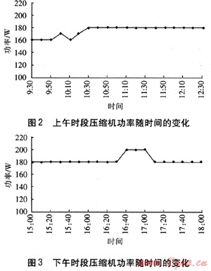 在空調(diào)模式下,工作設(shè)備主要有空調(diào)壓縮機(jī)、空調(diào)風(fēng)機(jī)、加壓風(fēng)機(jī)。在實(shí)驗(yàn)過程中,測(cè)試開始后0.5h系統(tǒng)進(jìn)入穩(wěn)定階段,采用功率表測(cè)試這3個(gè)設(shè)備的功率。上下午時(shí)段空調(diào)壓縮機(jī)功率的測(cè)試數(shù)據(jù)分別見圖2、3。由圖2、3可知,在上午時(shí)段,壓縮機(jī)的最大功率達(dá)到180W,最小功率為160W。在下午時(shí)段,最大功率達(dá)到了200W,其余時(shí)段保持在180W。