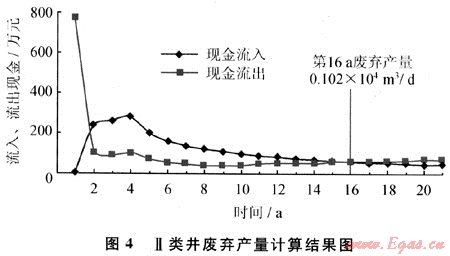 氣井20a評(píng)價(jià)期,在目前技術(shù)經(jīng)濟(jì)條件下,生產(chǎn)到第16a時(shí),單井產(chǎn)量0.102×104m3/d,當(dāng)年現(xiàn)金流出70.19萬(wàn)元,總銷(xiāo)售收入70.18萬(wàn)元(圖4)。為此,Ⅱ類(lèi)井的廢棄產(chǎn)量為0.102×104m3/d,經(jīng)濟(jì)生產(chǎn)期17a。