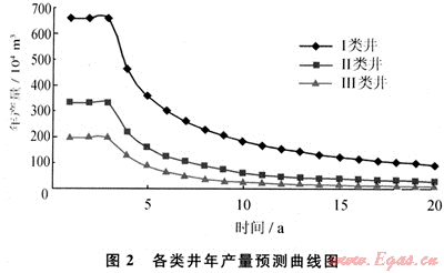 圖2表明,在自然穩(wěn)產(chǎn)期各類(lèi)井日產(chǎn)量差別較大,Ⅰ類(lèi)井為2.0×104m3/d、Ⅱ類(lèi)井為1.0×104m3/d、Ⅲ類(lèi)井為0.6×104m3/d。同時(shí),Ⅰ類(lèi)井在進(jìn)入遞減生產(chǎn)初期遞減幅度最大,Ⅱ類(lèi)井次之,Ⅲ類(lèi)井遞減幅度最小。因此,隨著遞減生產(chǎn)時(shí)間的延長(zhǎng),Ⅰ類(lèi)井、Ⅱ類(lèi)井、Ⅲ類(lèi)井的產(chǎn)量差距逐步減小。而不同類(lèi)型氣井產(chǎn)量變化的共同特點(diǎn)是初期遞減快,后期遞減逐漸變小。