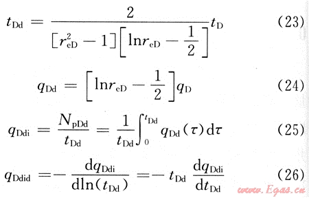在繪制典型曲線前,對無量綱時間和無量綱產(chǎn)量進(jìn)行變換,引入如下變量[6]: