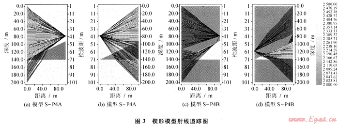 模擬結(jié)果表明,在設(shè)計井間地震觀測系統(tǒng)時,應(yīng)當力求將射線的入射角控制在臨界角以內(nèi)。同時,為了更好地反映井間介質(zhì)的變化,應(yīng)該采取下傾激發(fā)、上傾接收的方式。因此,物理模型實驗可以為野外井間觀測系統(tǒng)設(shè)計提供直觀的依據(jù)。