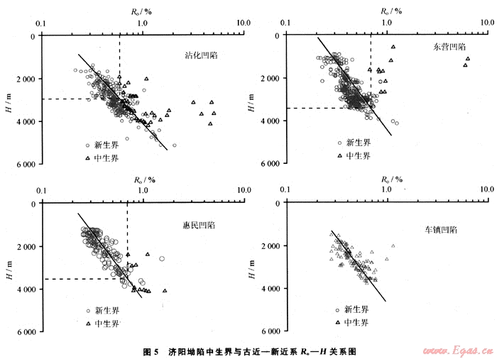 沾化凹陷中生界與新生界有機質(zhì)成熟度演化曲線相交于2900~3000m,其鏡質(zhì)體反射率在0.6左右。這表明,在新生界沉積前,中生界自身的沉積和較高的地溫梯度[9、21~23]已使烴源巖中有機質(zhì)的熱演化程度達到成熟階段。因而,通過新生代沉積進而使中生界烴源巖再次活化生烴所需的門限深度大于3000m,Ro>0.6%(圖5)。