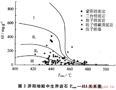 有機質(zhì)類型是評價烴源巖質(zhì)量的重要指標。從濟陽坳陷中生界烴源巖Tmax-HI關(guān)系圖可以看出(圖2),巖石樣品主要落在了混合型-腐殖型干酪根范圍內(nèi)。其中坊子組的泥巖、碳質(zhì)泥巖和煤的有機質(zhì)類型均以偏腐殖混合腐殖型為主,蒙陰組巖石樣品有機質(zhì)類型相對較好,樣品點主要落在偏腐泥混合-偏腐殖混合型范圍內(nèi),三臺組主要為腐殖型。