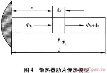 ② 對于散熱器根部溫度高于周圍空氣溫度的肋片,將其視為一維穩(wěn)態(tài)導(dǎo)熱問題,傳熱模型見圖4。
