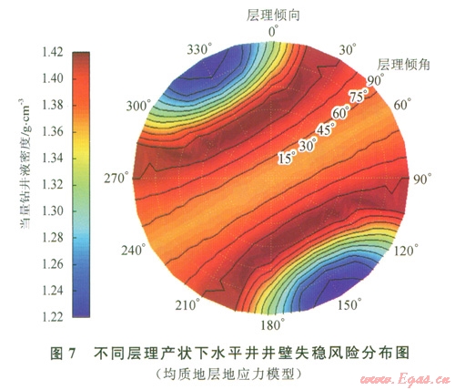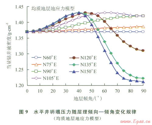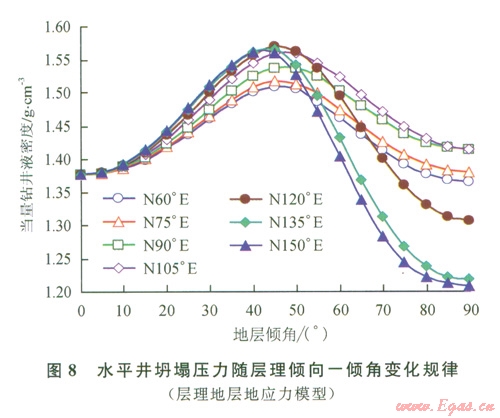 3)在鉆進(jìn)地層傾角為30°~60°之間的頁巖氣藏水平井時,應(yīng)注意具有較高的坍塌壓力。近水平和近垂直的地層中坍塌壓力有所降低,降低幅度與地層傾向有關(guān),越接近最小地應(yīng)力方向下降幅度越大。
