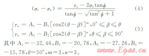 本研究簡化了Jaeger及McLamore[12-13]等人建立的強(qiáng)度準(zhǔn)則,根據(jù)實(shí)驗(yàn)數(shù)據(jù)采取了內(nèi)摩擦角恒定,黏聚力(τ)隨角度變化的頁巖地層強(qiáng)度公式: