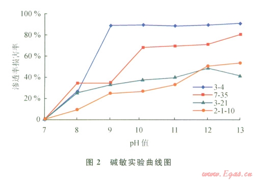 堿敏性是指具有堿性(pH值大于7)的工作液進(jìn)入儲(chǔ)層后,與儲(chǔ)層巖石或流體接觸而發(fā)生反應(yīng)生成沉淀,堵塞孔喉使儲(chǔ)層滲透能力下降的現(xiàn)象。