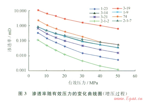 隨有效壓力的增大,巖樣滲透率急劇下降,下降幅度很大(圖3),尤其是在低壓力區(qū)間。以第一個(gè)壓力點(diǎn)(5 MPa)的滲透率為初始滲透率,計(jì)算不同有效壓力下滲透率與初始滲透率的比值——滲透率比,對(duì)全部實(shí)驗(yàn)數(shù)據(jù)進(jìn)行分析可以看出,當(dāng)有效壓力由5 MPa增大到20 MPa時(shí),滲透率下降為初始值的ll.0%~29.4%,平均為20.2%,即滲透率下降了約4/5;當(dāng)有效壓力增大到50 MPa時(shí),滲透率下降為初始值的1.10%~7.04%,平均為3.73%,即剩余滲透率都低于10%,表明滲透率的下降幅度非常大,應(yīng)力敏感性強(qiáng)。
