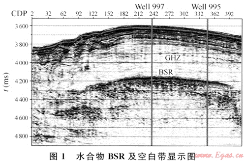 空白反射帶在反射地震剖面上通常與BSR伴生,位于BSR之上。在含天然氣水合物地層中,由于地震波速度增大,使得它與下伏地層之間的反射系數(shù)增大,在地震剖面上,天然氣水合物的底邊界出現(xiàn)相應的強反射界面,而在含天然氣水合物的層內(nèi),由于沉積物孔隙被水合物充填膠結,使地層變得均勻,減少波阻抗差,地震反射剖面上通常表現(xiàn)為弱振幅或振幅空白帶(圖1)。