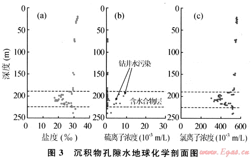 地球化學識別主要基于海底淺表層沉積物、沉積物中的自生礦物及底水的綜合分析和研究。淺層沉積物和底層海水的甲烷濃度異常高,通過對烴類氣體運移路徑的追蹤可以間接識別和評價天然氣水合物;淺層沉積物孔隙水含量和異常是識別水合物層的依據(jù),一般來說,含天然氣水合物的沉積層的孔隙水鹽度和氯度會降低(圖3)。其次孔隙水中的氧化-還原電位和硫酸鹽含量的降低也可能是天然氣水合物存在的標志[8]。