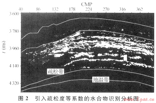 采用疊前AVO反演求得縱橫波速度信息[7]。通常海洋中淺層地層的地震縱波速度為1.6~1.8km/s,在含天然氣水合物層中,地震波速度將提高至1.85~2.5km/s,在速度剖面上,水合物層的層速度變化趨勢呈典型的三段式,即上下低,中間高。同時結合疏松系數(shù)、地熱梯度等參數(shù),可以提高水合物識別的可信度(圖2)。