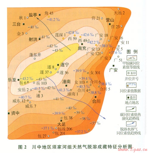 四川盆地中部地區(qū)須家河組地層中水溶氣脫溶聚集與側(cè)向運(yùn)移的現(xiàn)象也很明顯。該區(qū)在廣安、合川、安岳等地探明天然氣地質(zhì)儲量超過4 000×