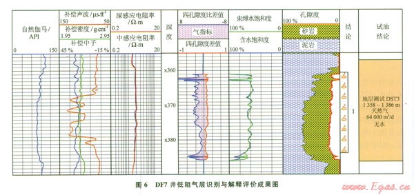 圖5、6分別為DF3井與DF7井低阻氣層識(shí)別與解釋評(píng)價(jià)成果圖。其中前3道為常規(guī)原始曲線,氣層段的電阻率極低,約1.7 Ω·m,與上下泥巖層電阻率極為接近,是典型的低阻氣層。該氣層只用電阻率曲線是無法判斷的,直接由密度、中子、聲波測(cè)井曲線判斷也比較困難。第5道為含氣指示,利用四孔隙度比值(藍(lán)色線)與差值(粉紅色線)曲線重疊的方法直觀反映氣層與水層。第6道為利用文中所述的方法計(jì)算得到的含水飽和度與束縛水飽和度曲線。