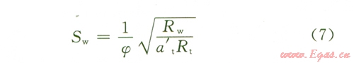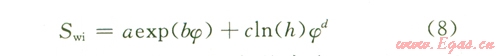 根據(jù)研究區(qū)低阻形成的機(jī)理可知,本區(qū)低阻氣層以細(xì)砂巖、粉細(xì)砂巖為主,顆粒細(xì)、排驅(qū)壓力大、束縛水飽和度較高;低阻氣層中的陽離子交換量很低,因而泥質(zhì)的附加導(dǎo)電性可以忽略。因此,對(duì)于這類高束縛水飽和度引起的低阻油氣藏可用以下模型計(jì)算含水飽和度: