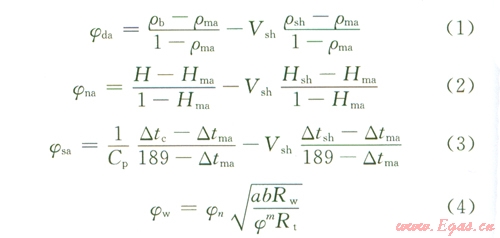 由泥質(zhì)砂巖體積模型可寫出地層流體為淡水時(shí)地層視密度孔隙度(φda)、視中子孔隙度(φna)、視聲波孔隙度(φsa)和含水孔隙度(φw),即