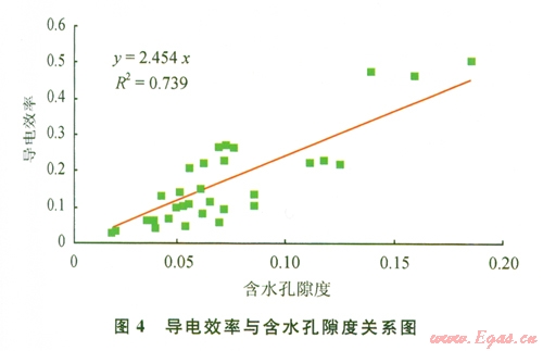 利用上式計(jì)算低阻氣層含水飽和度,關(guān)鍵是確定式中的以a't值,高楚橋利用巖心巖電實(shí)驗(yàn)結(jié)果剖析了導(dǎo)電效率(E)與含水孔隙度(φw)之間的關(guān)系[6-7],二者之間具有良好的線性關(guān)系,由此可以利用研究區(qū)地層溫壓條件下的巖電實(shí)驗(yàn)結(jié)果求得式(7)中的a't值,見圖4。由此可知a't=2.454.