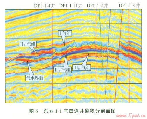東方l-l鶯二段氣層在地震剖面上具明顯的低頻強(qiáng)振幅特征,原因是高沉積速率的砂泥巖,壓實和成巖作用弱,兩者間密度速度差別很小,砂巖含氣后,速度和密度都大大降低,產(chǎn)生強(qiáng)波阻抗差,形成亮點(diǎn)和AV0異常;高頻吸收明顯,并在氣層較厚、產(chǎn)狀較陡時具平點(diǎn)特征(圖6),這種現(xiàn)象在鶯歌海盆地非常普遍,是識別淺層氣層的重要手段之一。