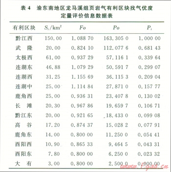 式中Poi表示第i個有利區(qū)塊的頁巖氣找氣優(yōu)度;Foi表示第i個有利區(qū)塊頁巖氣平均有利度;Si表示第i個有利區(qū)塊的面積。