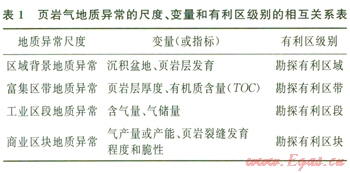 地質(zhì)異常找礦理論和方法是基于對“致礦地質(zhì)異?!钡纳钊胙芯浚瑢Πǚ莻鹘y(tǒng)礦產(chǎn)資源在內(nèi)的各類礦產(chǎn)資源進(jìn)行預(yù)測的有效理論和方法[l8],其在非傳統(tǒng)金屬礦床的勘探中已經(jīng)取得了很大成功[19-22]。對于頁巖氣這種非傳統(tǒng)油氣資源,地質(zhì)異常找礦理論與方法也具有廣闊的應(yīng)用前景。筆者基于頁巖氣地質(zhì)異常理論框架研究成果,根據(jù)頁巖氣的特殊地質(zhì)條件,將頁巖氣藏的地質(zhì)異常序列區(qū)分為區(qū)域背景地質(zhì)異常、富集區(qū)帶地質(zhì)異常、潛在工業(yè)區(qū)段地質(zhì)異常和商業(yè)區(qū)塊地質(zhì)異常4個層次:①區(qū)域背景地質(zhì)異常主要指標(biāo)包括沉積盆地和頁巖發(fā)育;②頁巖氣富集區(qū)帶地質(zhì)異常主要指標(biāo)包括頁巖厚度和總有機碳含量(TOC);③頁巖氣潛在工業(yè)區(qū)段地質(zhì)異常的主要指標(biāo)包括氣含量和氣儲量;④頁巖氣商業(yè)區(qū)塊地質(zhì)異常的主要指標(biāo)包括頁巖氣產(chǎn)量、產(chǎn)能、頁巖的裂縫發(fā)育程度和脆性。這4個層次的異常分別是頁巖氣勘探有利區(qū)域、頁巖氣勘探有利區(qū)帶、頁巖氣勘探有利區(qū)段和頁巖氣有利區(qū)塊等4個不同有利級別預(yù)測區(qū)圈定的依據(jù)。頁巖氣地質(zhì)異常的尺度、變量、有利區(qū)級別的相互關(guān)系可概括為表l。