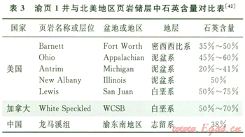 渝東南地區(qū)下志留統(tǒng)龍馬溪組頁巖中的石英含量與美國已開發(fā)頁巖儲層中的石英含量相當(dāng)(表3),渝東南地區(qū)龍馬溪組頁巖中石英的平均含量為38%,表明該區(qū)頁巖氣儲層多具有良好的可壓裂性。