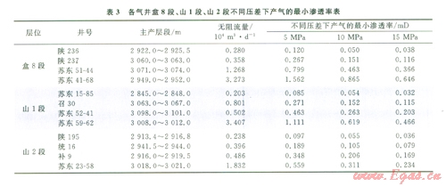 根據(jù)單層試氣井試氣資料,在產(chǎn)能一定的情況下,就可以計算出蘇東地區(qū)主力氣層段產(chǎn)工業(yè)氣的滲透率下限(表3)。根據(jù)目前蘇東地區(qū)天然氣儲量規(guī)范,2 000~3