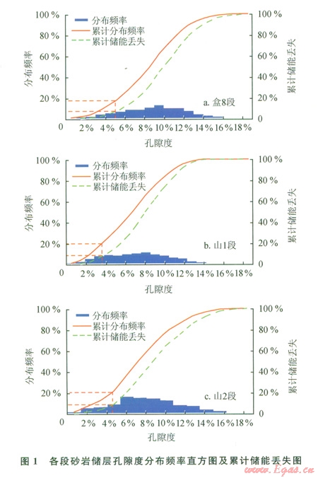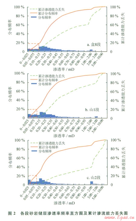 經(jīng)驗統(tǒng)計法是以巖心分析孔隙度、滲透率資料為基礎(chǔ),以低孔滲段累計儲滲能力丟失占總累計的5%左右為界限的一種累計頻率統(tǒng)計法,現(xiàn)已被國內(nèi)各大油田所采用[1-6]。利用蘇東地區(qū)盒8段、山1段、山2段儲層常規(guī)物性分析資料,編制的孔隙度、滲透率頻率分布、累計頻率及累計能力丟失曲線見圖l、2??紫抖葍饽芰?、滲透率產(chǎn)氣能力的計算公式為: