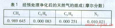 經(jīng)預(yù)處理凈化后的原料天然氣的組成(本文皆為摩爾分?jǐn)?shù))見表l。其溫度為310.00 K,壓力為4.0 MPa,摩爾質(zhì)量為l6.17 9/mol,物質(zhì)的量流量為1.000 kmol/h。