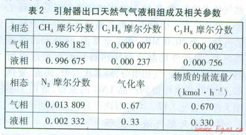 初始運(yùn)行時(shí),原料氣冷卻所需冷量由外加制冷劑提供。當(dāng)換熱器3出口的天然氣溫度達(dá)到203.15 K時(shí),天然氣從拉法爾噴管噴出并進(jìn)入引射器,由于沒有被引射氣體,故此刻僅以原料氣組分從引射器出口流出,控制其出口溫度使之在1.2 MPa壓力下的氣化率為0.67。通過比較計(jì)算結(jié)果和實(shí)驗(yàn)結(jié)果,可得出用SRK方程計(jì)算烴類混合物的氣液相平衡是可靠的H 3,本文選用SRK方程計(jì)算天然氣氣液相的相平衡。利用ASPEN.HYSYS7.2計(jì)算得前述天然氣組成,并且得出引射器出口溫度為152·43 K。引射器出口天然氣氣液相組成及相關(guān)參數(shù)見表2。