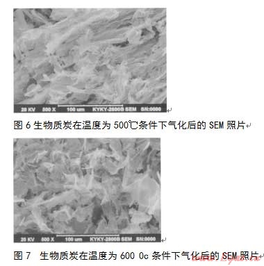 生物質炭在蒸汽作用下發(fā)生氣化,其微觀結構也會發(fā)生變化。使用掃描電子顯微鏡(SEM)對不同溫度下,生物質炭經過蒸汽氣化后的微觀結構進行研究。生物質炭在溫度分別為500、600、700和800℃條件下氣化后的SEM照片分別見圖6~9。