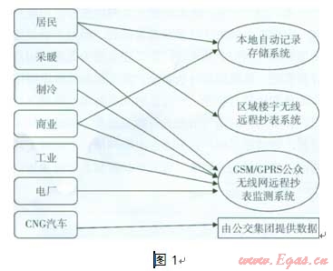 2004年初,結合“城市燃氣供應規(guī)劃指標、用氣規(guī)律及其用氣量預測的研究”項目的開展,北京市燃氣集團通過3種方法在用戶數(shù)據(jù)采集傳輸方面做出了初步的探討與嘗試。該項目將北京市的現(xiàn)有燃氣用戶分為居民、采暖、制冷、商業(yè)、工業(yè)、電廠、CNG汽車7類,需要采集各類用戶的小時用氣數(shù)據(jù),根據(jù)用戶性質的不同及所用計量儀表的特點我們分別采取以下3種方法進行了燃氣用戶的數(shù)據(jù)記錄、存儲、采集與傳輸(見圖l)。
