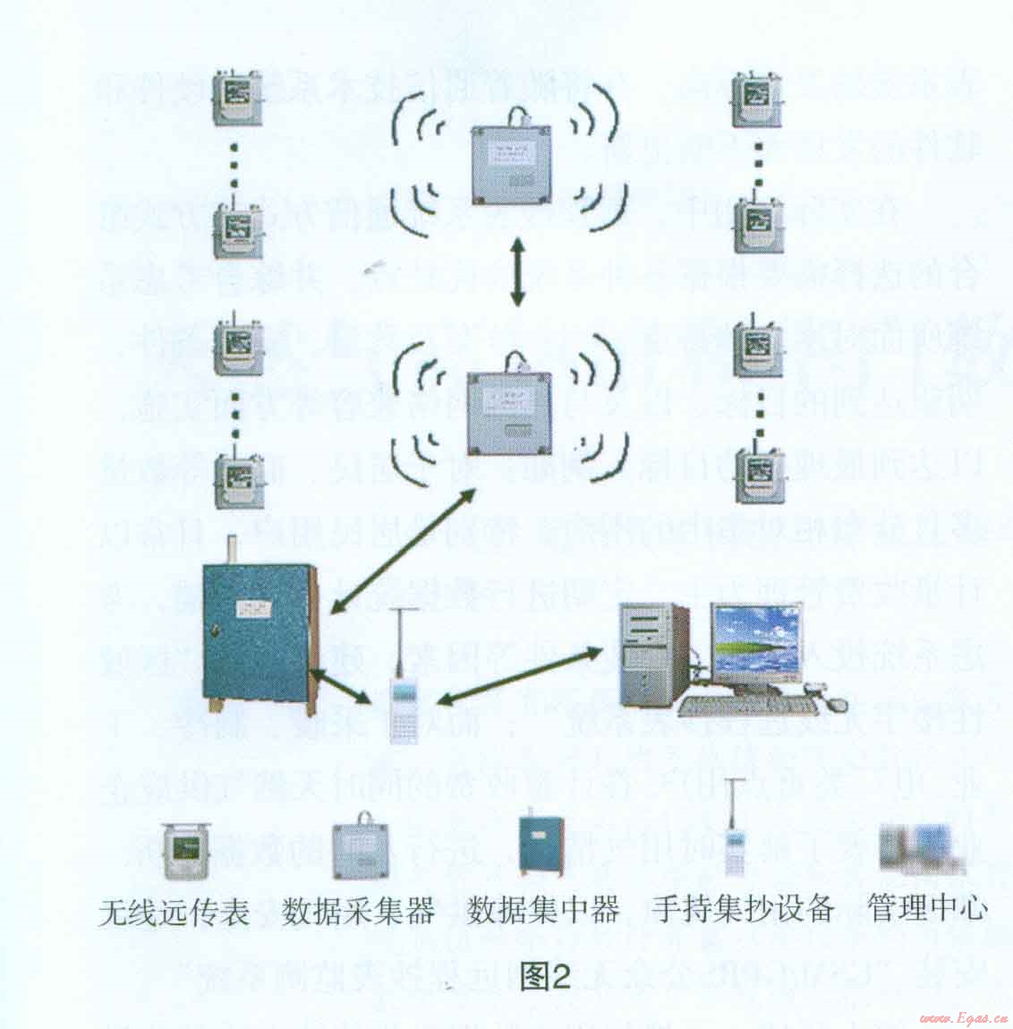 該系統(tǒng)由無線遠傳表、數(shù)據(jù)采集器、數(shù)據(jù)集中器、手持集抄設備、管理巾心組成。無線遠傳表、采集器、集中器之問以短距微功率無線方式傳遞數(shù)據(jù)。無線遠傳表將計量的數(shù)據(jù)送至采集器;采集器收集一組無線遠傳表的數(shù)據(jù)后送至集中器;工作人員定期持手持抄表設備在集中器安置現(xiàn)場收集無線遠傳表計量數(shù)據(jù),然后帶回管理中心對數(shù)據(jù)進行統(tǒng)計分析(見圖2)。