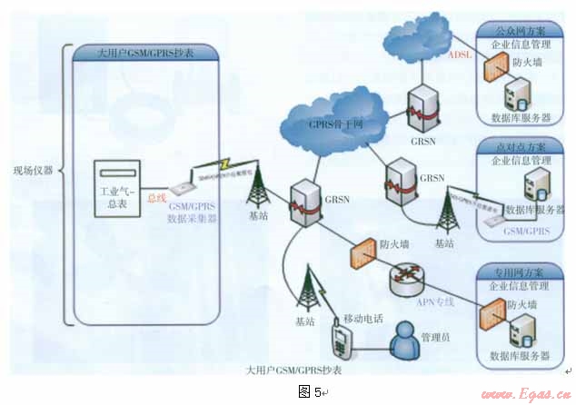及上位機數(shù)據(jù)庫管理軟件系統(tǒng)組成。主要安裝在采暖、制冷樣本用戶及部分商業(yè)、工業(yè)樣本用戶,其利用GSM無線公網中的數(shù)據(jù)傳輸功能(短消息方式和GPRS無線網絡方式)來實現(xiàn)對用戶現(xiàn)場燃氣流量、壓力等數(shù)據(jù)的遠距離無線傳輸(見圖5)。管理人員通過計算機數(shù)據(jù)庫管理系統(tǒng)采取實時讀取存儲數(shù)據(jù),定時發(fā)送的方式遙控用戶帶有GSM/GPRS燃氣表數(shù)據(jù)采集傳輸器的現(xiàn)場計量儀表來實現(xiàn)信息采集與傳輸。通過幾年的使用,該系統(tǒng)運行穩(wěn)定,抄表率較