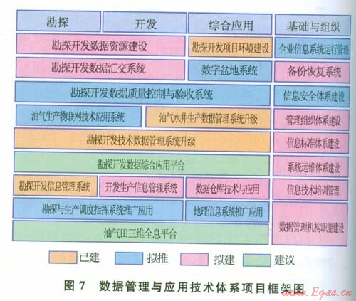 為滿足勘探開發(fā)核心業(yè)務(wù)生產(chǎn)管理、科研需要的信息化建設(shè)需求,以數(shù)據(jù)建設(shè)、數(shù)據(jù)管理、數(shù)據(jù)應(yīng)用技術(shù)體系架構(gòu)為依托,從勘探、升發(fā)、綜合廈用和基石出與組織等4個(gè)方面著手,部署油氣田公司數(shù)據(jù)管理與應(yīng)用技術(shù)體系項(xiàng)目框架(圖7)。數(shù)據(jù)管理與應(yīng)用技術(shù)體系項(xiàng)目框架分已建、擬推、擬建和建議4個(gè)層次。