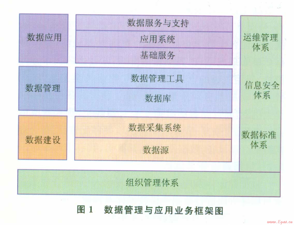 圖1中包含了數(shù)據(jù)業(yè)務(wù)體系和基礎(chǔ)保障體系。其中基礎(chǔ)保障體系包括:①組織體系,油氣田公司數(shù)據(jù)管理與應(yīng)用的組織體系建設(shè)分為決策層、領(lǐng)導(dǎo)層、管理層和執(zhí)行層4個(gè)層次;②標(biāo)準(zhǔn)體系,信息標(biāo)準(zhǔn)體系是技術(shù)體系中重要的組成部分,有2層含義,一是業(yè)務(wù)層面的業(yè)務(wù)活動、業(yè)務(wù)單元標(biāo)準(zhǔn)化,如井、地質(zhì)構(gòu)造命名,油氣生產(chǎn)流程等,二是計(jì)算機(jī)層面的元數(shù)據(jù)標(biāo)準(zhǔn)化;③安全體系,信息安全系統(tǒng)中各個(gè)安全組件或要素只有整合成一個(gè)整體協(xié)同作用時(shí),才能有效保證企業(yè)整體安全管控的目標(biāo)得以實(shí)現(xiàn)。油氣田公司信息安全框架為油氣田公司提供一個(gè)全面的、基于信息安全建設(shè)最佳實(shí)踐的、結(jié)合了業(yè)界相關(guān)開放標(biāo)準(zhǔn)的安全模型口3;④運(yùn)維體系,合理地建立與完善運(yùn)行維護(hù)體系,保障在用信息系統(tǒng)的正常運(yùn)行,才能滿足油氣田科研、生產(chǎn)和管理業(yè)務(wù)活動需求。