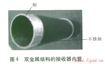 由于接收器的工作壓力高達(dá)l0 MPa,綜合考慮成本、效率、安全等因素,通常采用不銹鋼管作為內(nèi)管,但不銹鋼的熱導(dǎo)率較低,僅為15~18 W/(m·K),而銅可達(dá)450 W/(m·K),這易造成接收器周向熱流量和汽液分布不均,甚至發(fā)生彎曲變形,最終導(dǎo)致玻璃外套管破裂、接收器偏離聚焦線。為了解決這一問題,V.Flores等人[8]提出了一種雙金屬結(jié)構(gòu)的接收器內(nèi)管(見圖4),內(nèi)層采用具有高熱導(dǎo)率的銅以減小管內(nèi)傳熱的周向溫差,外層采用不銹鋼以保證內(nèi)管的工作強(qiáng)度,研究發(fā)現(xiàn)雙金屬結(jié)構(gòu)的內(nèi)管周向溫差較不銹鋼內(nèi)管顯著減小。W.Spirkl等人[9]在聚光集熱器中加入二次反射板,將聚光器匯聚的一部分太陽光反射到接收器的另一側(cè)。加入二次反射板后,接收器周向接收的太陽能較均勻,但增加了太陽光的反射次數(shù),降低了光效率。