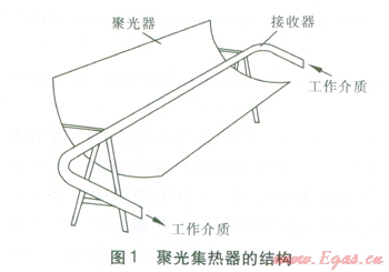 槽式太陽能發(fā)電系統(tǒng)將多個槽型拋物面聚光集熱器經(jīng)過串并聯(lián)的排列,收集較高溫度的熱能,加熱工作介質(zhì),產(chǎn)生蒸汽,驅(qū)動汽輪發(fā)電機(jī)組發(fā)電。系統(tǒng)包括:聚光集熱器(由聚光器、接收器組成)、換熱系統(tǒng)、工作介質(zhì)循環(huán)動力設(shè)備、汽輪發(fā)電機(jī)等。聚光集熱器的結(jié)構(gòu)見圖1。聚光器采用拋物面形,將太陽光反射匯聚到接收器上。接收器由表面鍍有太陽選擇性膜層的鋼管(內(nèi)管)及玻璃外套管組成,二者之間的空間為真空,以減少傳熱損失。