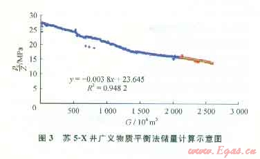 圖1為蘇5-X氣井的壓降儲量計算示意圖。該井于2006年10月12號投產(chǎn),截至2010年底已累計采出天然氣243.12×104m3,根據(jù)曲線可計算得到:G=530.26×104m3。