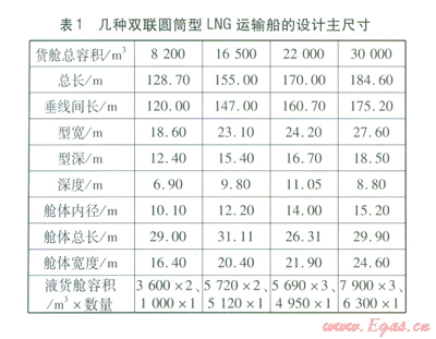 國(guó)內(nèi)外雙聯(lián)圓筒型LNG運(yùn)輸船的設(shè)計(jì)主尺寸[15-16]見(jiàn)表l,支線LNG船的液貨艙尺寸即為表l中容積22